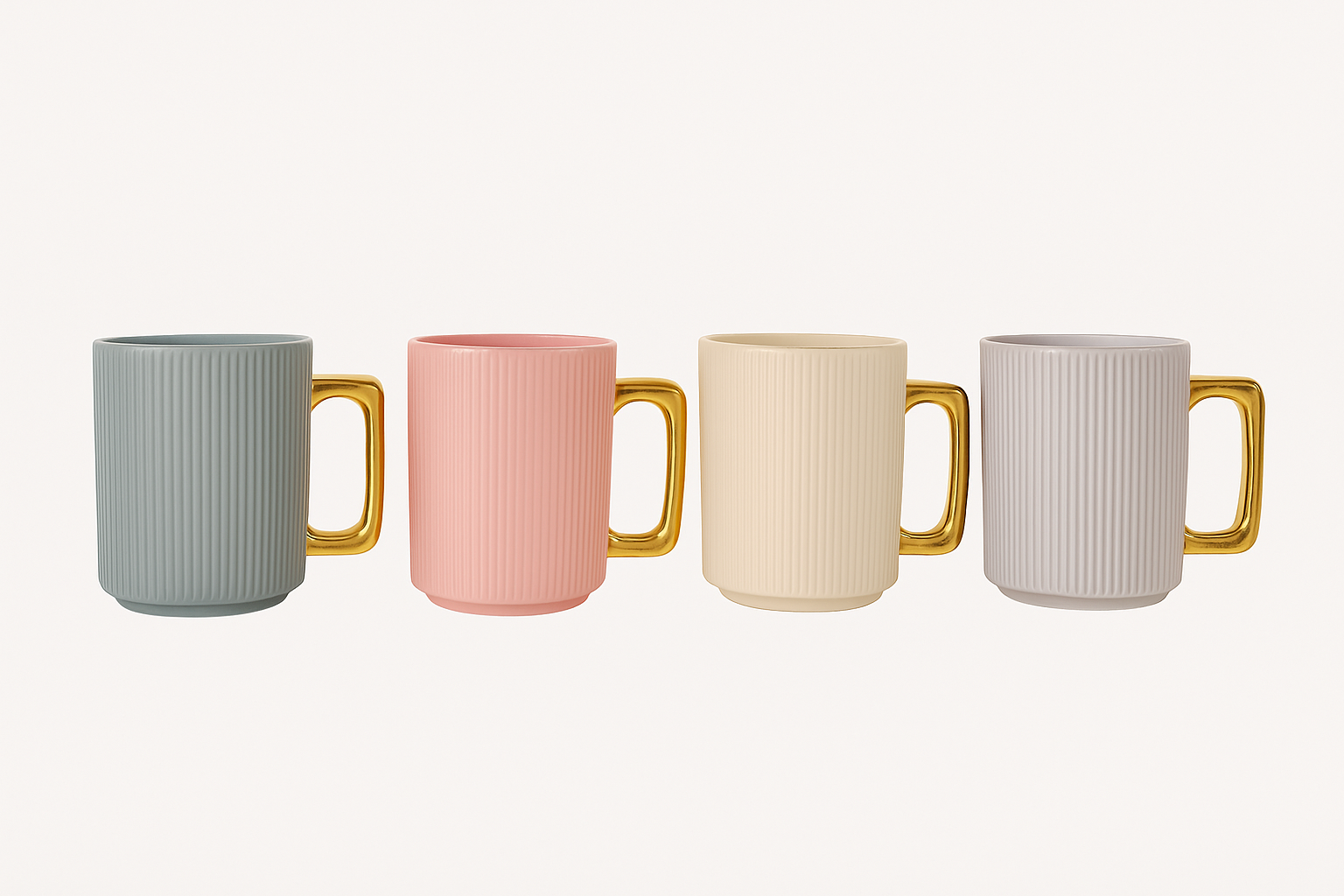 Elevate your drinkware collection with these elegant cups featuring a sophisticated blend of grey, pink, yellow, and dark green hues. Each cup is beautifully complemented by a luxurious gold holder, adding a touch of refinement to every sip. Perfect for entertaining or daily use, these cups combine style and functionality to enhance your beverage experience.